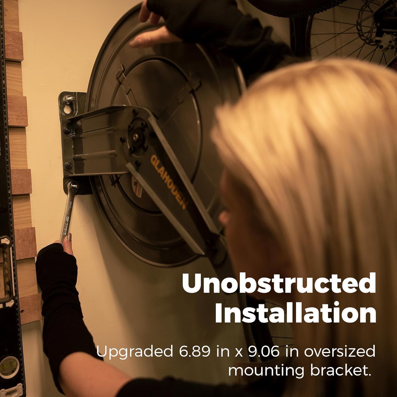 - Larger Mounting Bracket: GLAHODEN compressor hose reel has increased the bracket size to 6.89 in × 9.06 in, you can easily access the back of the air hose reel retractable to tighten the bolts. The upgraded high-strength expansion bolts make the installation more solid and reliable.