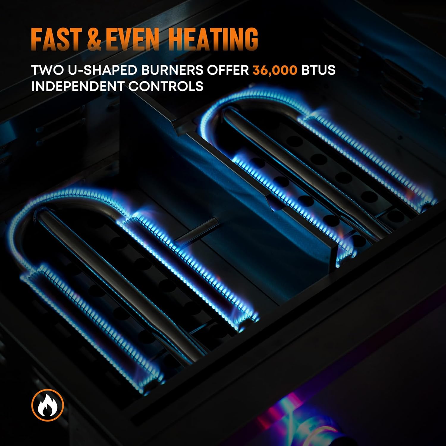 - 【36,000 BTUs for Quick Cooking】The outdoor kitchen griddle features 2 H-shaped steel tube burners which deliver a total of 36,000 BTUs across the 446 square inch cooking surface, so you can grill with confidence on the premium griddle.