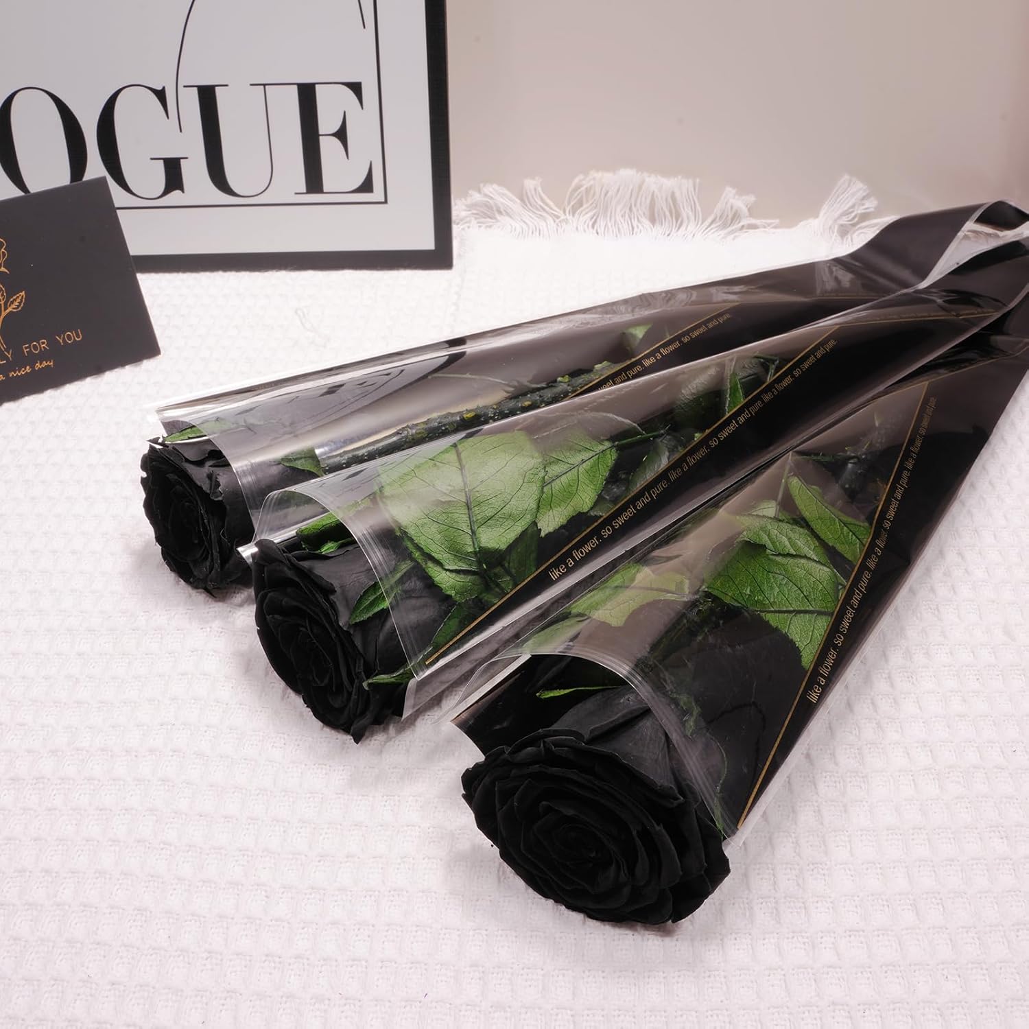 - Eternal Real Rose with Stems: Package includes- 3 x Preserved flowers roses, 3 x Flower wrapping bags, 1 x Greetings CardsοΌ1 x Rose gift box. The preserved flowers rose with long stems are 30 to 32 cm(11.81 to 12.6 in) length, the roses have a diameter of 5 to 6 cm(1.97 to 2.36 in) and some of their thorns have been removed to avoid injury. Preserved flowers roses for delivery prime