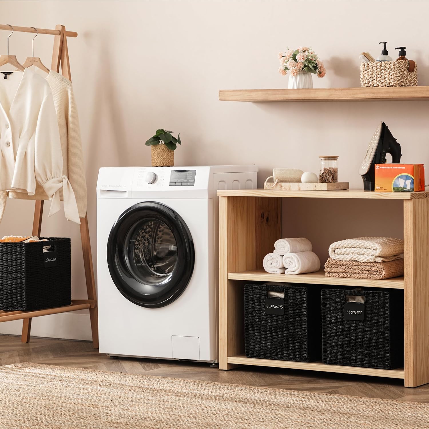 UBBCARE 2 Pack Wicker Basket, 10.5×10.5 Storage Cubes with Label, Foldable Cube Storage Bin with Handle, Square Storage Basket for Shelves, Woven Paper Rope Basket for Organizing, Black