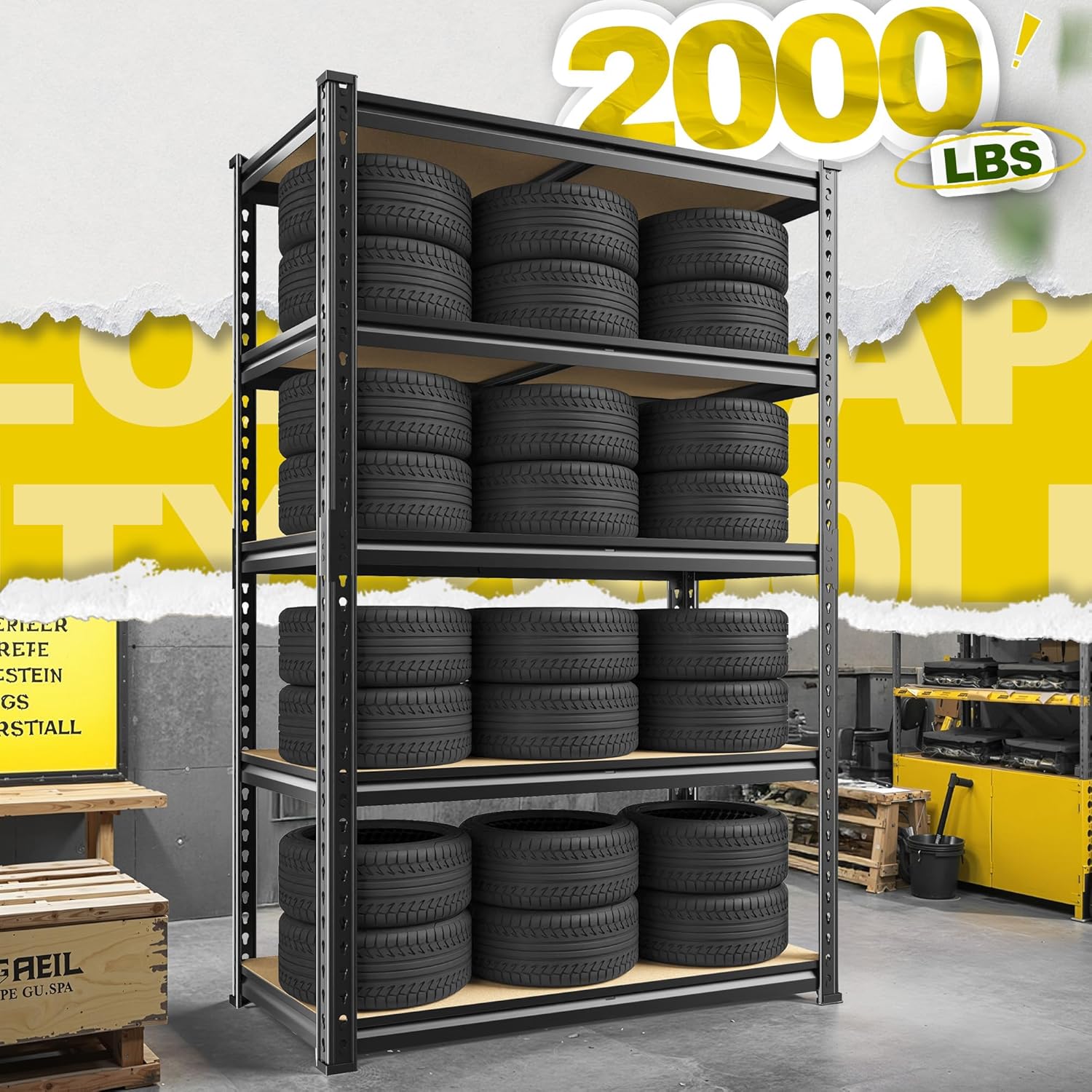 - ă2000LBS Garage Storage Shelves with Rolled Edge DesignăThe storage shelf is constructed from 5mm MDF and thickened metal frame. Rolled edge design of the metal column is not only thicker and better quality of the column, but also protect your hands from scratches. Each shelf with 1 rib beneath, each layer can hold up to 400LBS, with a total bearing capacity of 2000LBS
