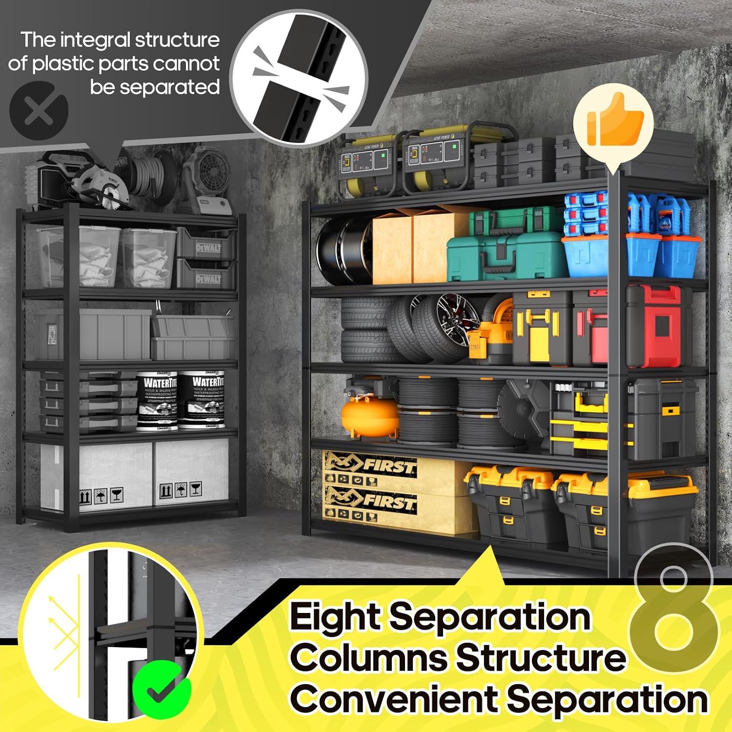 - ăVersatile Garage Organization Systemă Use as one tall garage storage rack or split into two smaller shelving units for flexible placement. Perfect for garage organization systems, garage storage shelves, or even as estantes de almacenamiento for basement and commercial use.