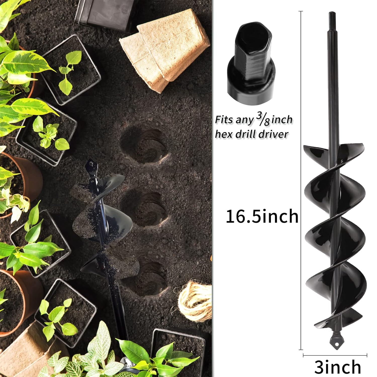 - Considerate Size Design: 0.3 inch (8mm) steel shaft with non-slip hex drive 0.3inch(8mm); 3-inch (8cm) diameter x 16.5inch (42cm) length.Quickly digs holes up to 16.5inches deep and 3inches wide using the power of your hand held drill. 16.5inch(42cm) length design will also help save your back, don’t need to bent down to do your garden work.