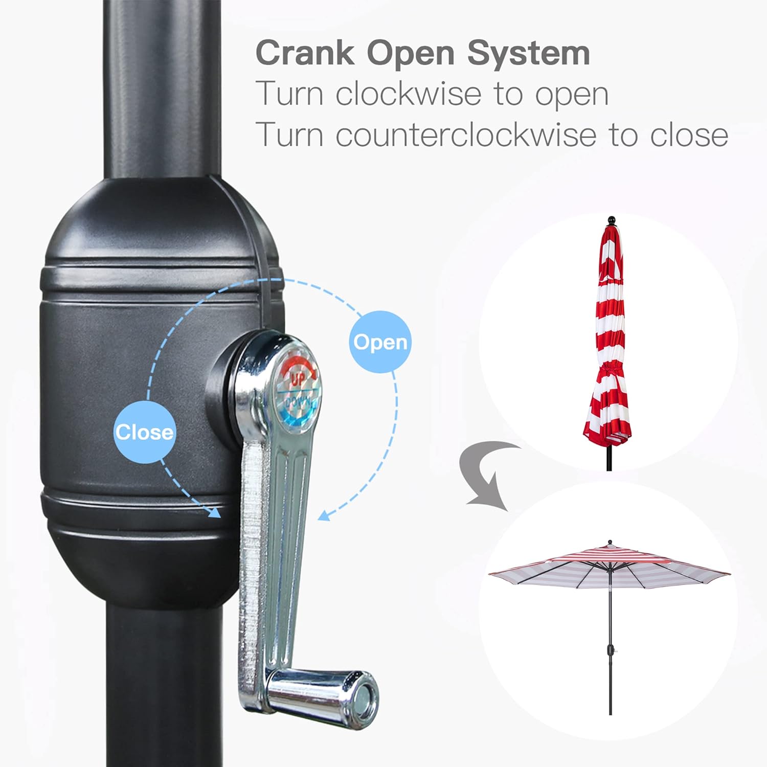 - Easy crank open function with push button tilt, keeping cool and comfortable form the sun.