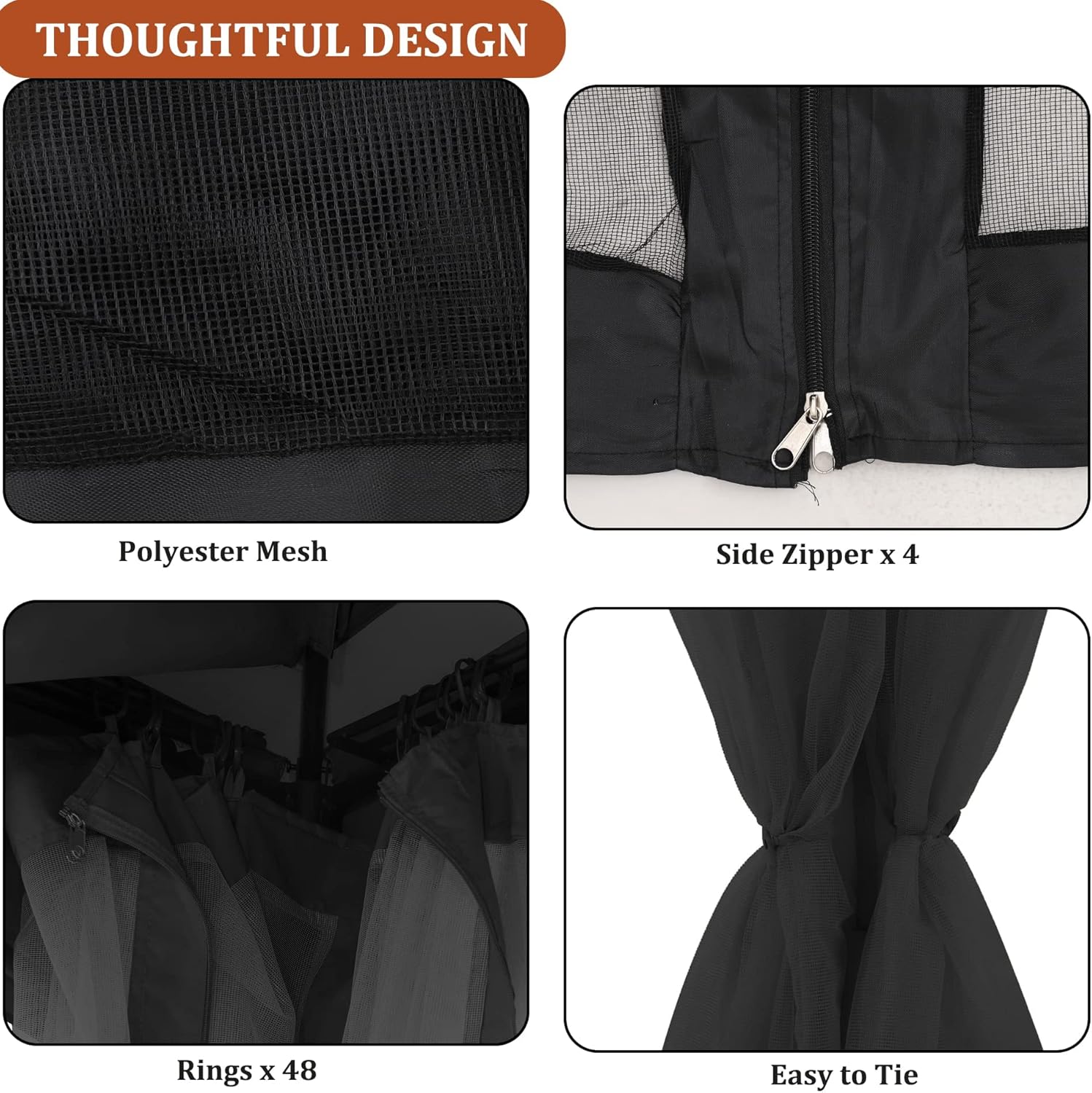 Gazebo Mosquito Netting Replacement 10' x 12' x 7'1'', Universal 4-Panel Screen Sidewall with Zipper, Black (Mosquito Net Only)