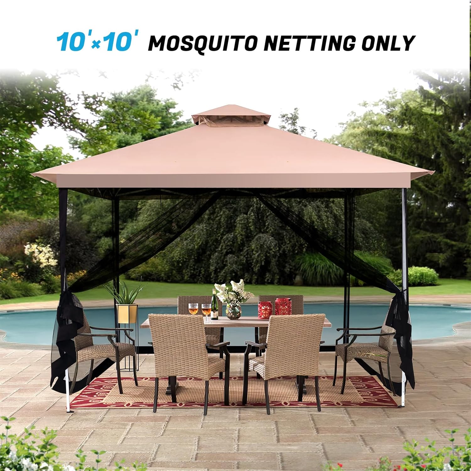 - [Effective protection] :10'x 10' Mosquito Netting for Patio can effectively protect oneself from the tiny“visitors”and ensure comfortable outdoor experience in summer. Breathable mesh ensures air circulation inside the canopy.