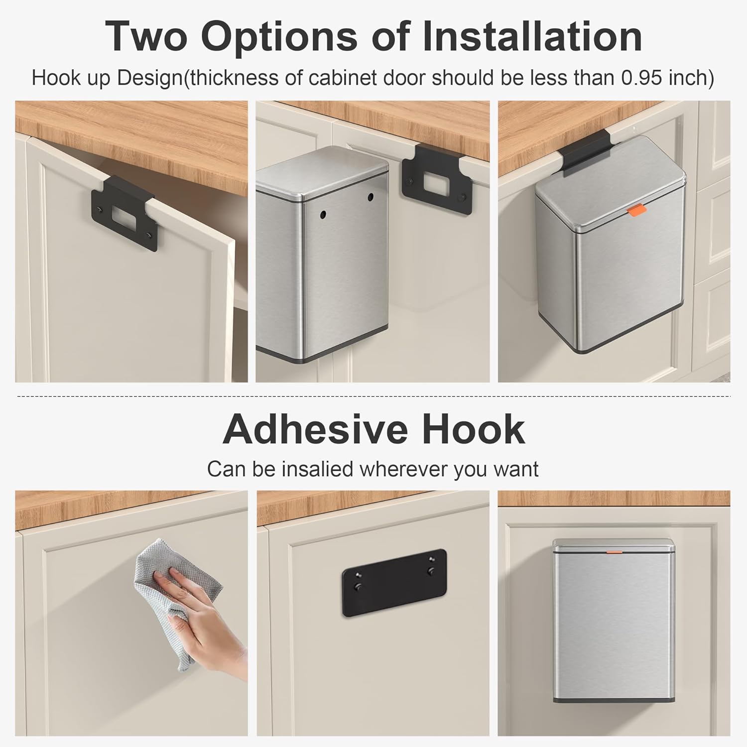 - 【WALL MOUNTED/COUNTERTOP/ UNDER SINK TRASH CAN】: No need to bend over. The trash can provide Two opening and installation methods,Effortless and Fits for Most Cabinet Doors, Pantry Doors. The thickness of door should be less than 0.98" (2.5cm). Small trash can can also be glued on kitchen or bathroom wall or under the sink.