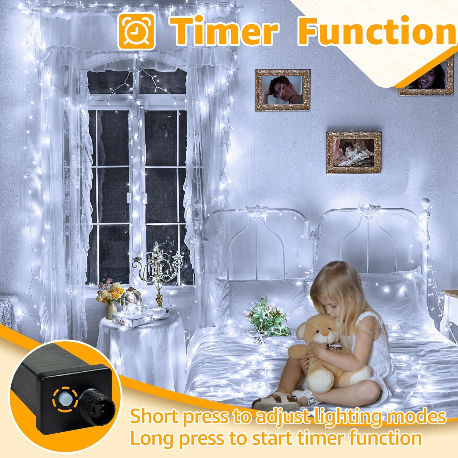 - Energy-Saving Timer Function: Built-in timer function automatically turns the lights on for 6 hours and off for 18 hours. This energy-saving feature helps reduce electricity bills. Activate the timer by long pressing the adapter button