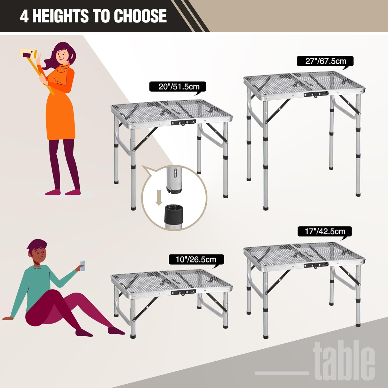 REDCAMP Small Folding Grill Table for Outside, 2Ft Lightweight 4 Height Adjustable Portable Metal Table with Mesh Desktop, Outdoor Table for Camping Picnic Beach and BBQ, Silver
