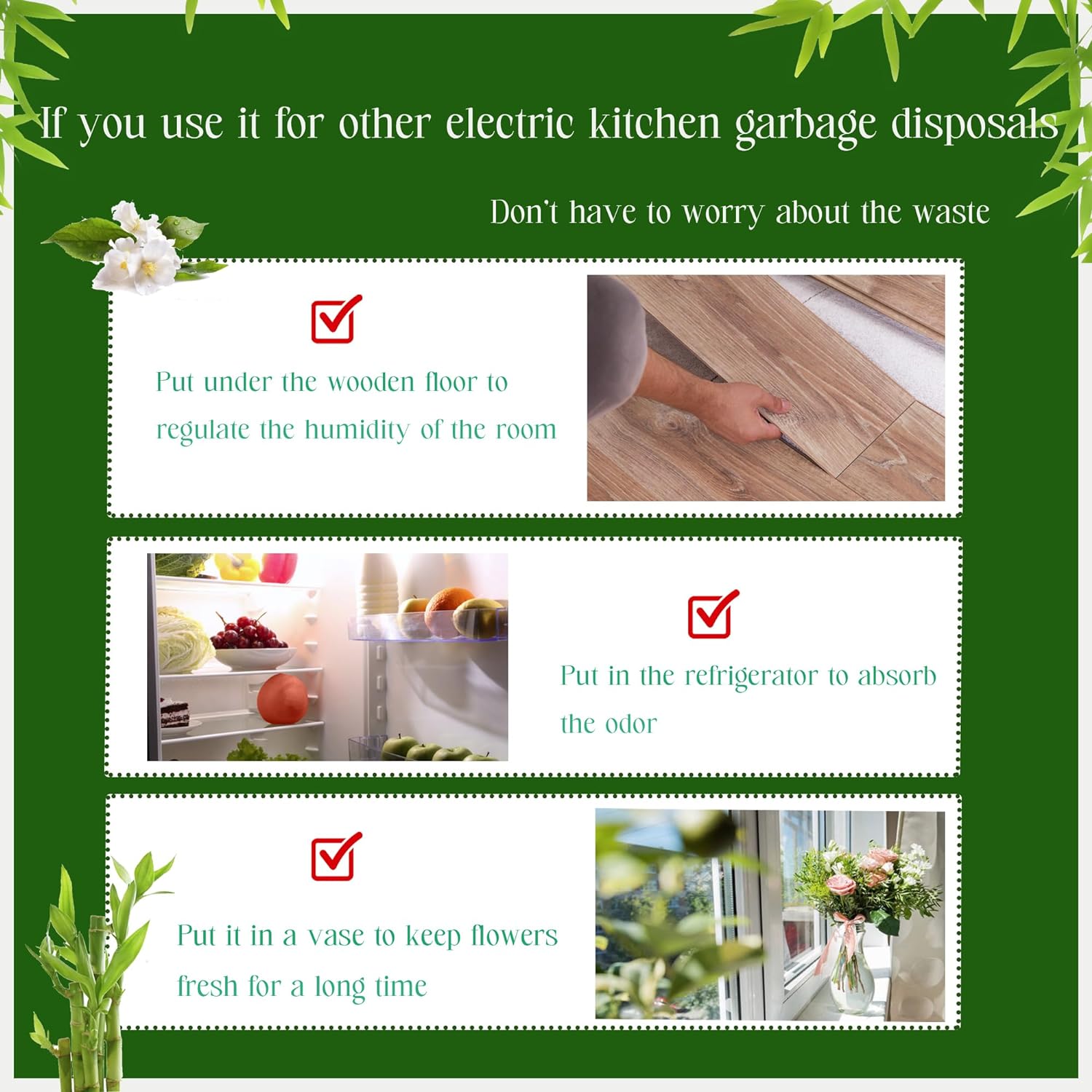 - MULTIPURPOSE: If you use it for other electric kitchen garbage disposals, don't have to worry about the waste due to the quantity, because our activated charcoal can also be put under the wooden floor to regulate the humidity of the room, and also put in the refrigerator to absorb the odor, or put it in a vase to keep flowers fresh for a long time. Used and discarded bamboo charcoal can be buried in the garden to change the quality of the soil.