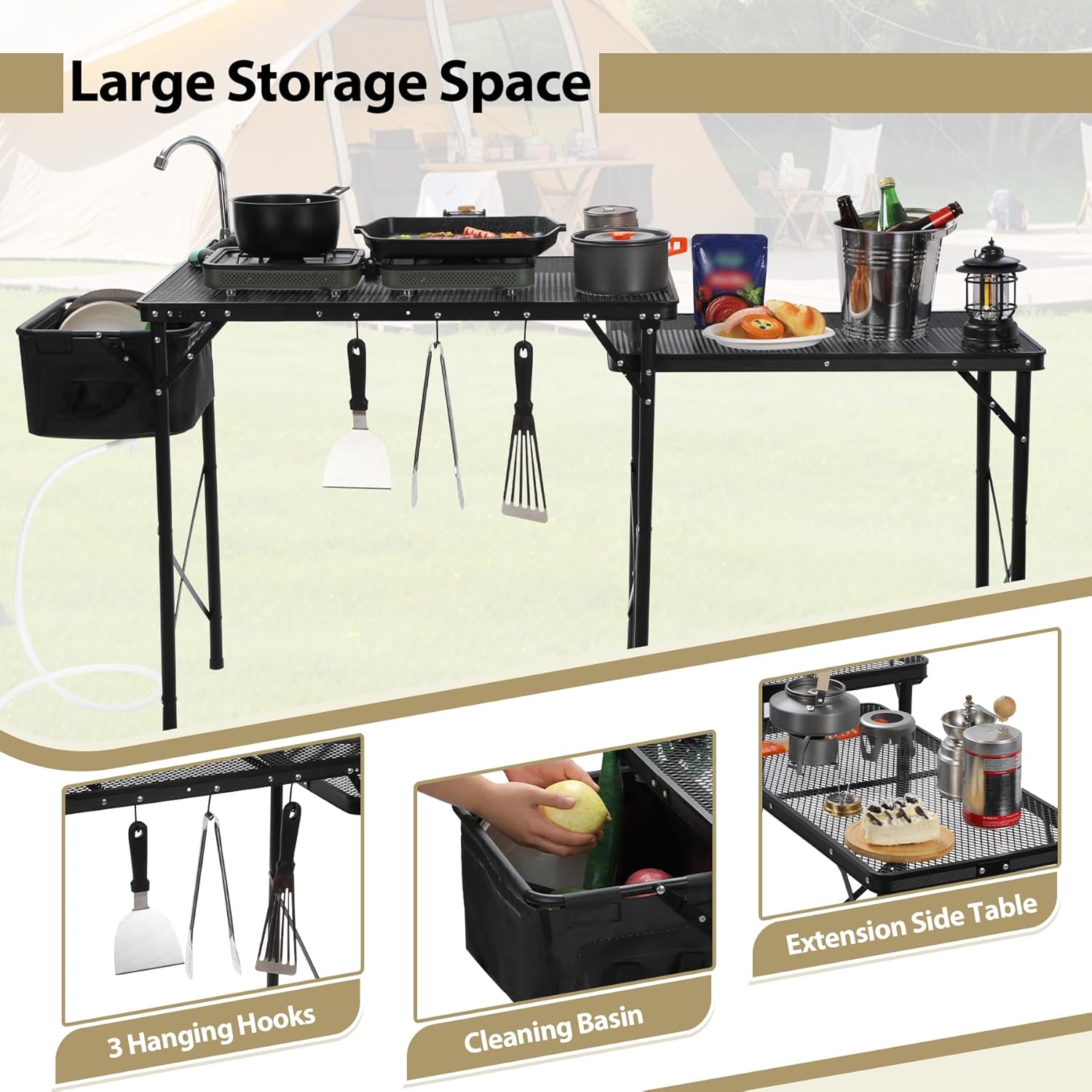 - Details: There are several hooks on the edge of the multifunctional table. You can use it to hang all kinds of kitchen utensils to help you cook better. There is also a detachable water basket on the side of the table. You can use it to clean fruits, vegetables and dishes, and can also be used as a storage bag.