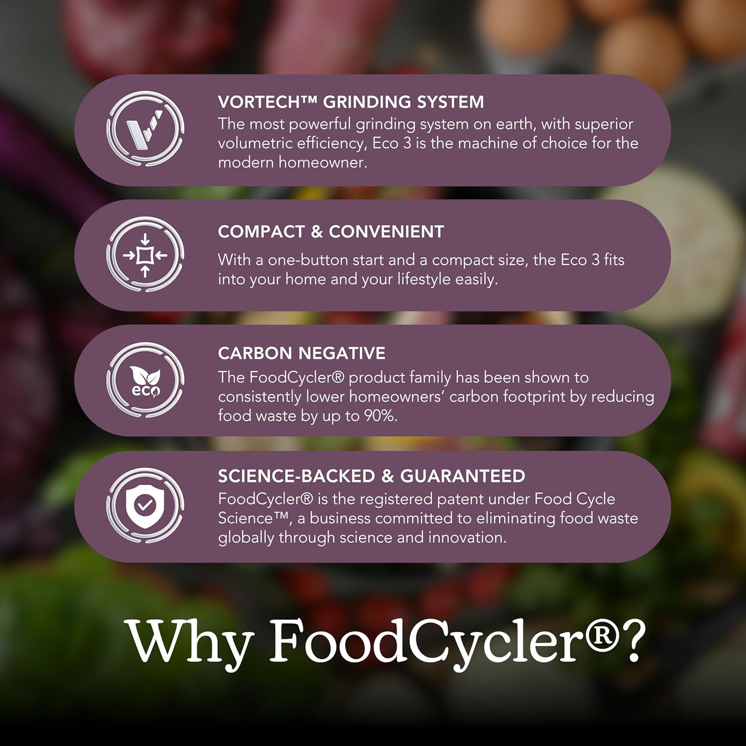 - INNOVATIVE VORTECH SYSTEM: The Eco 3’s Vortech(TM) patented grinding system can grind what others can't, so go ahead and toss in your pits, peels, bones, leftovers! Vortech's efficiency means the FoodCycler consumes less power than your average clothes dryer.