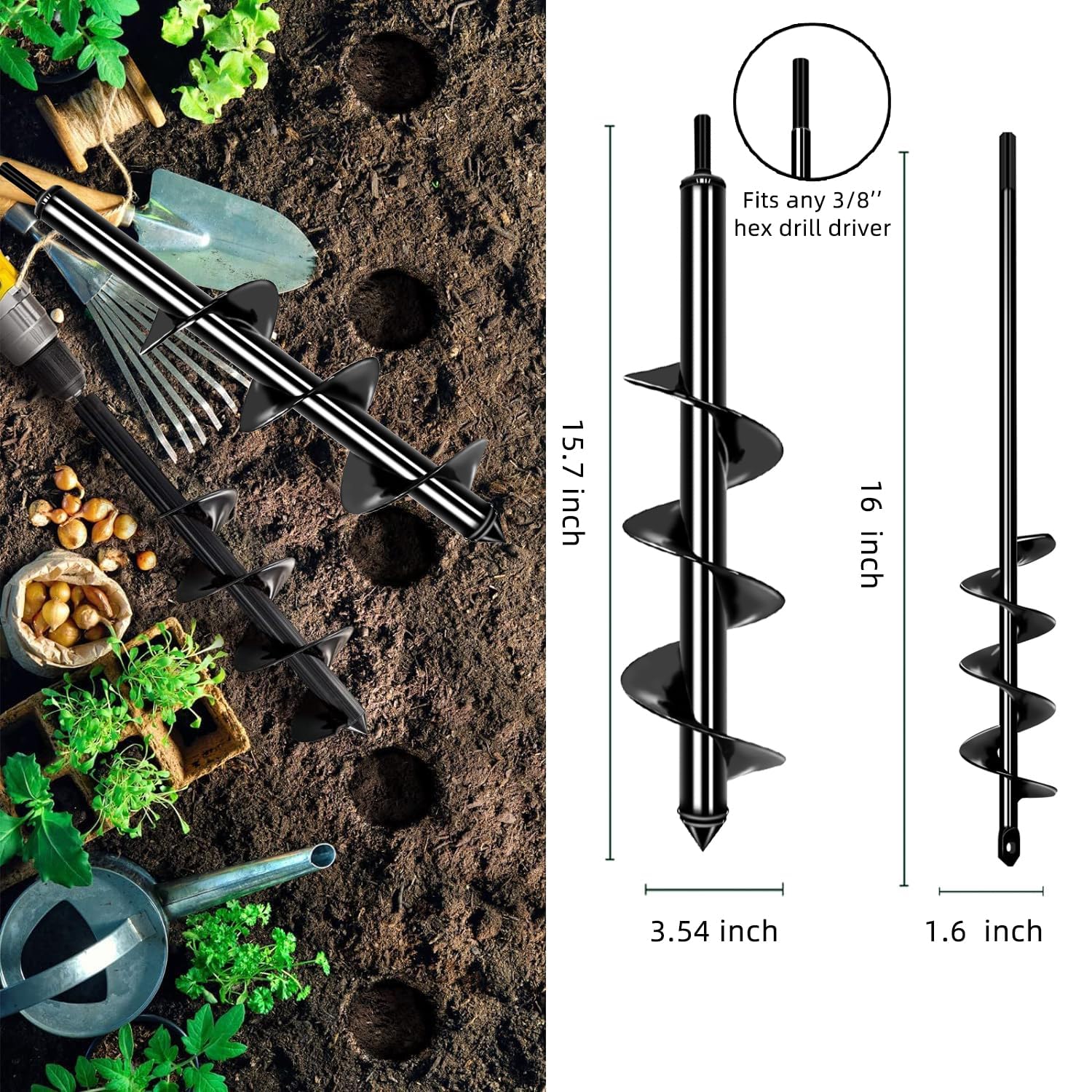 - 【Contain 2 pack Auger Drill Bit】:Our garden auger drill bit set 1.6 x 16 & 3.54 x 16.7 inches for detailed planting.All you need to do is attach the auger bit to a standard 3/8’’ hex bit drill.Hold with both hands,then turn it on to dig downward.Reverse the drill to pull the soil back up,and you get the perfect postholes