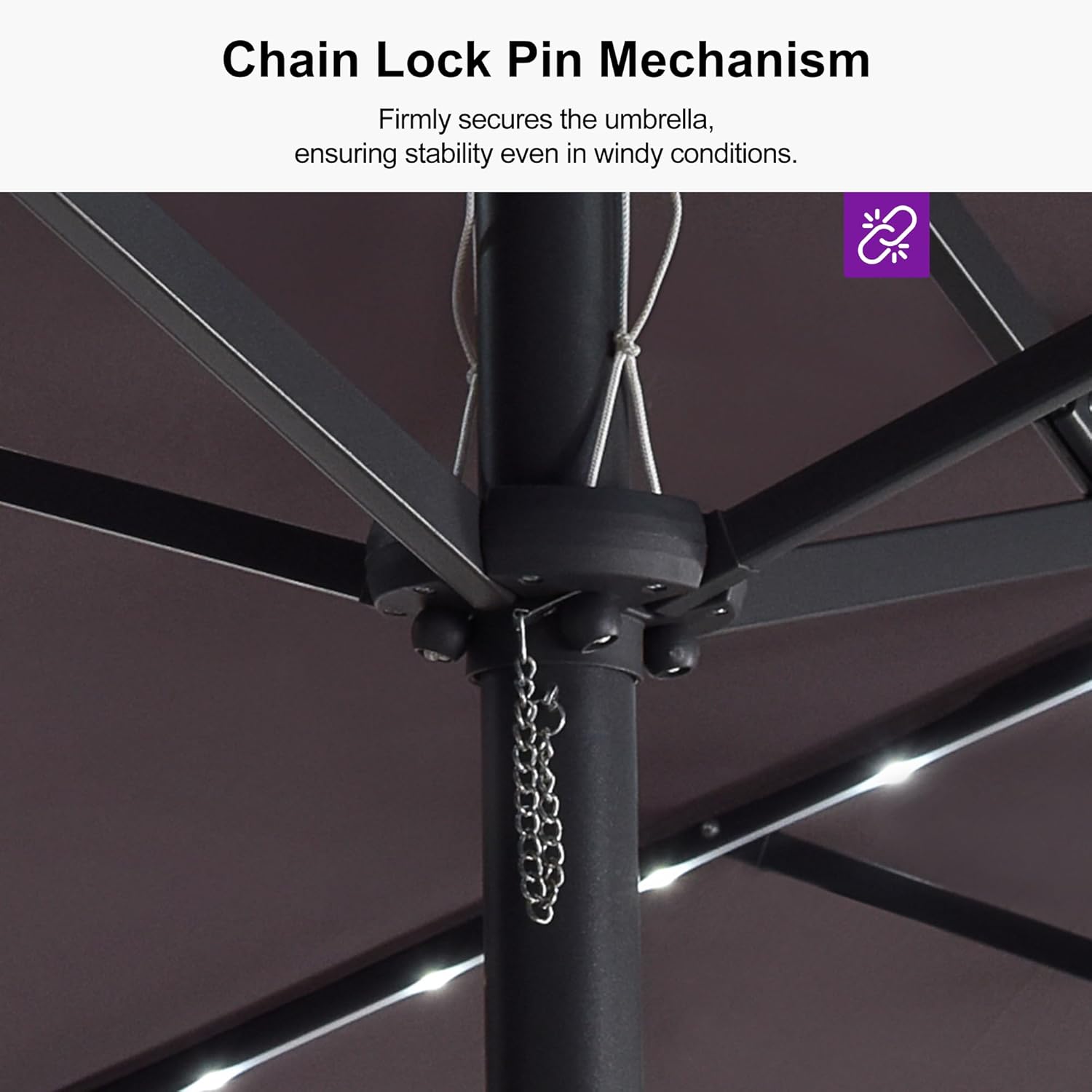 - Crank Design: The simple crank lifting system is equipped, enabling the convenient and rapid opening and closing of the patio umbrella. Additionally, an advanced chain lock pin is provided, ensuring the stability of the umbrella even in windy conditions