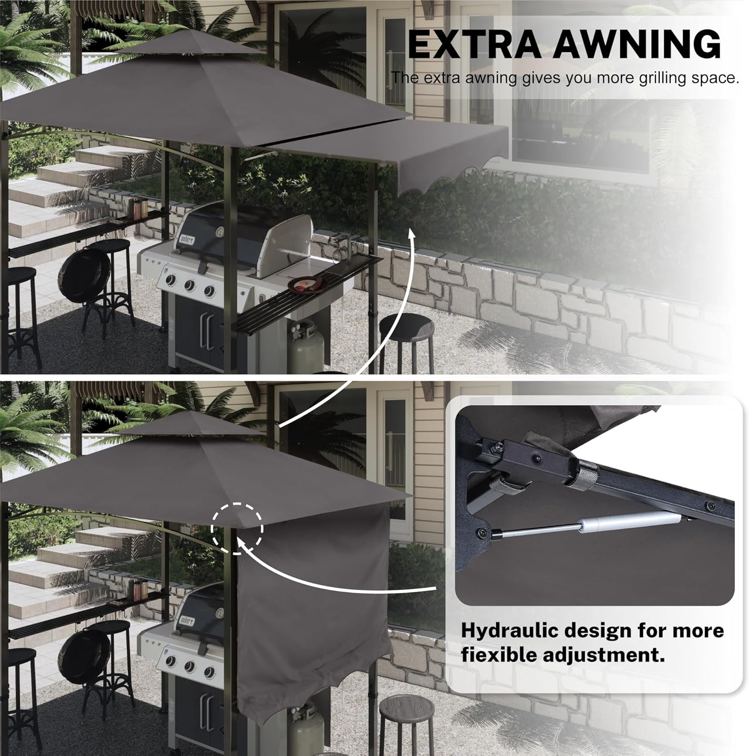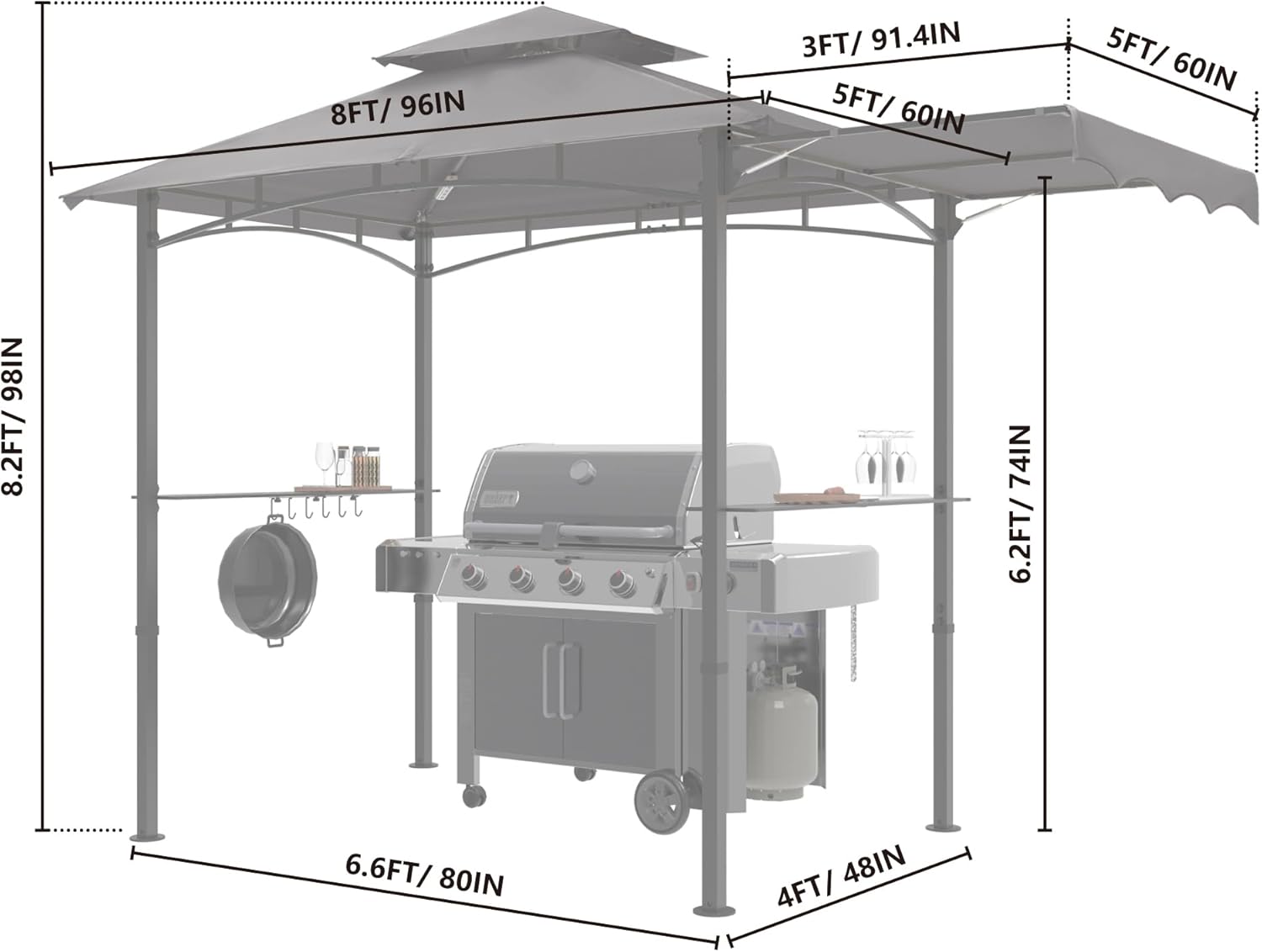- ✅Extra Side Awning:The new upgraded grill gazebo adds an extra awning, the extra awning can increase the grilling space as well as shade the food to keep it fresh, it also provides better rain protection for people and food.