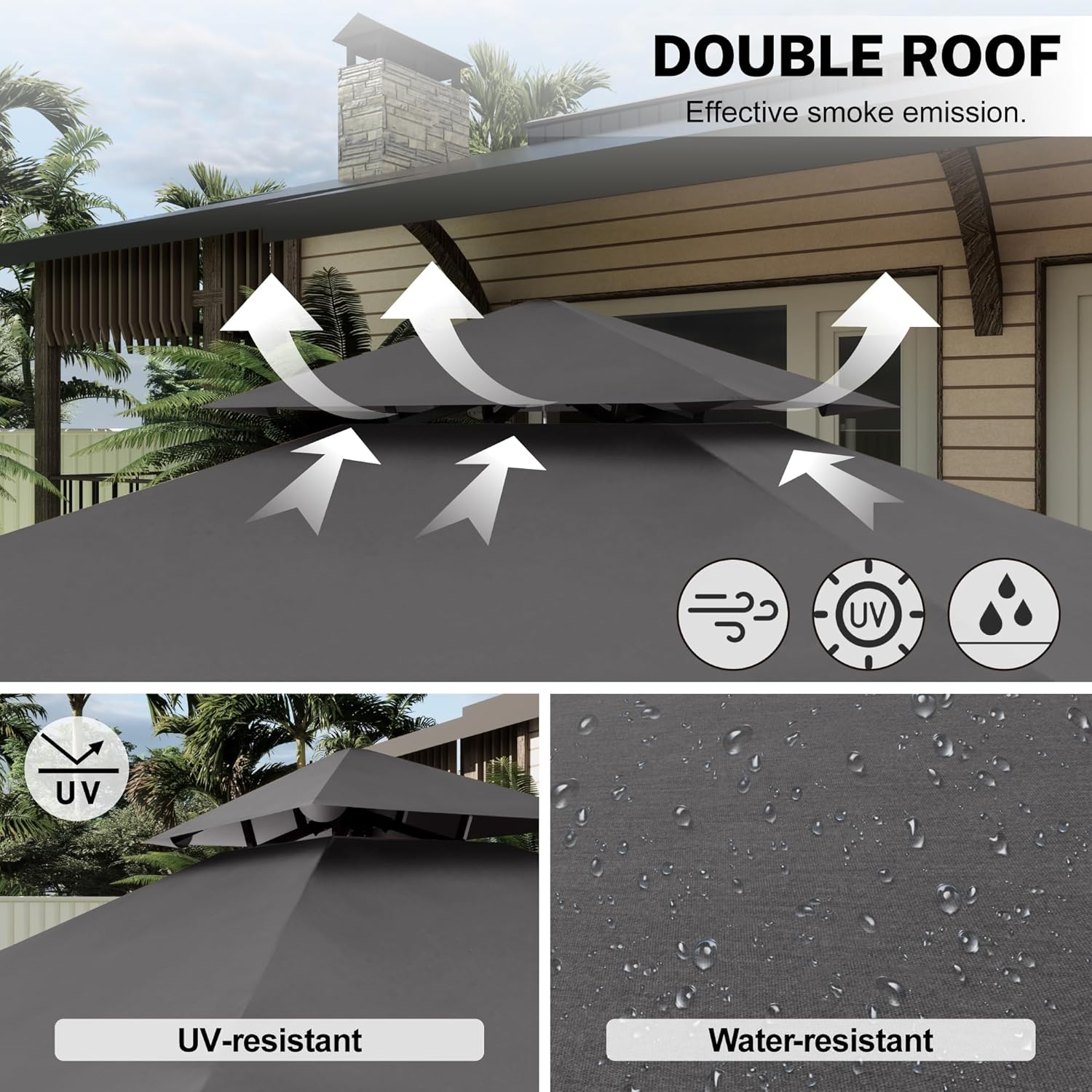 - ✅Double Roof Design: The roof is made of 50+UV material, which can effectively resist UV rays and is waterproof. The double-layer roof design can effectively exhaust the grease and smoke from the barbecue.