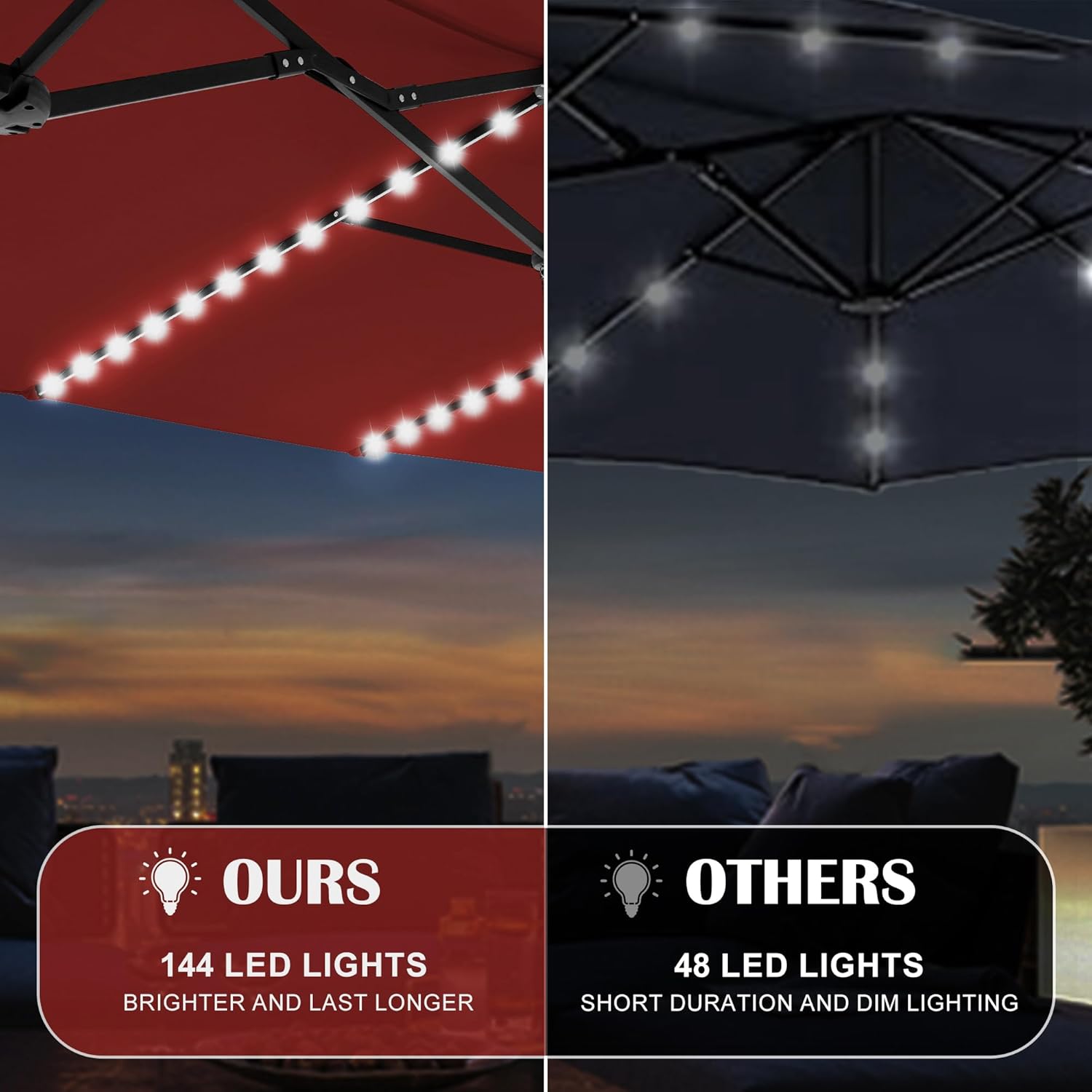 - 144 Brighter LED Bulbs: Our upgraded outdoor umbrella features enhanced solar panels, threefold LED count compared to conventional market offerings, and expanded battery capacity. This innovation delivers significantly boosted luminosity, 50% wider illumination coverage, and extended runtime—achieving 7 hours of nighttime operation per full charge, up from 4 hours