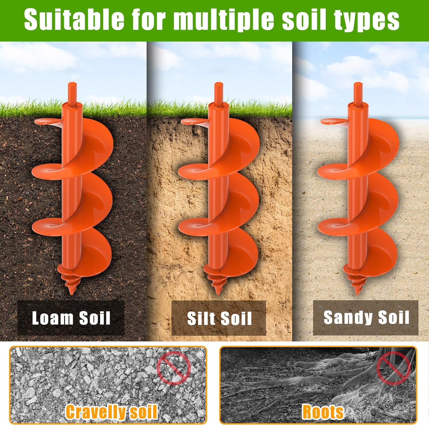 - πΊπππ&ππππππ ππ πΌππ: Each auger drill bit has no sharp edges, the 3mm thick helix makes it super easy and quick, which cut through clay, tough mud, sand, dirt and deals with rocks pretty well.