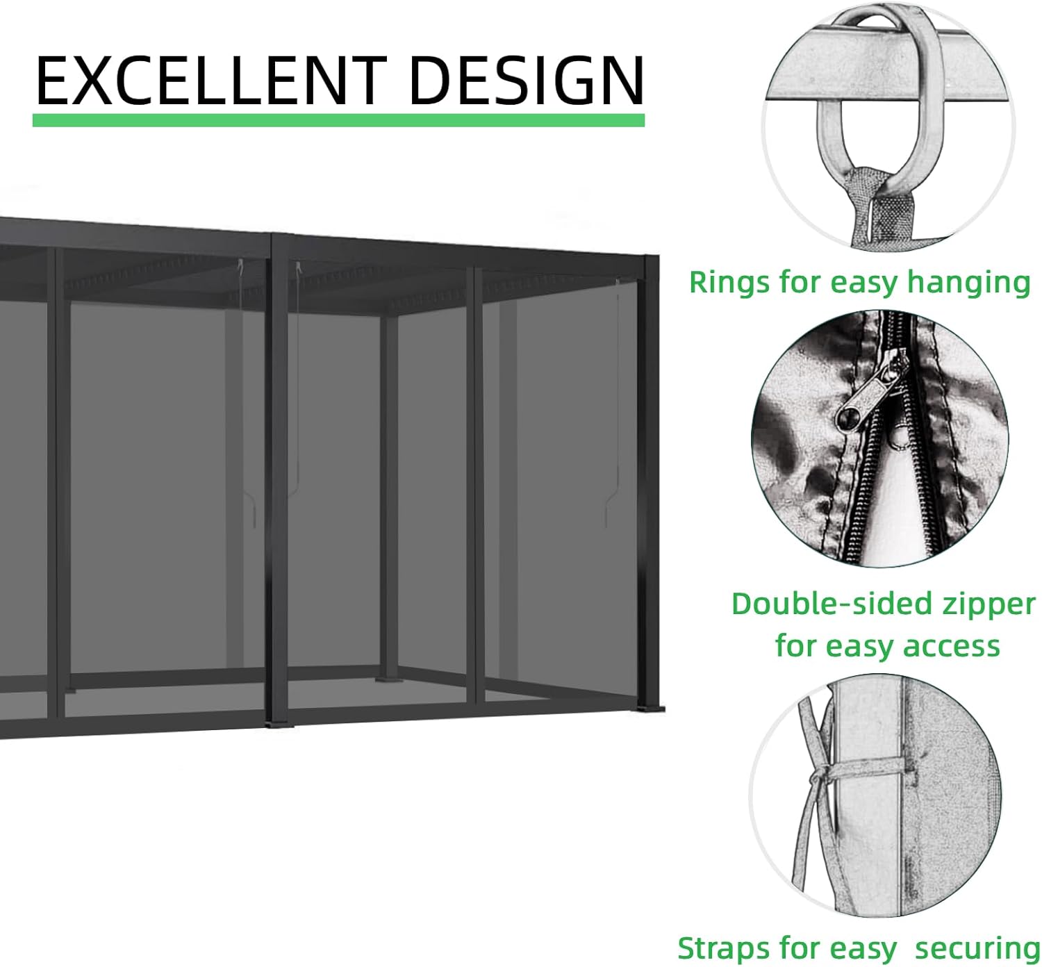 - 【Easy to Install】We provide plastic snap rings for easy hanging. Insert the rings into the netting loops and hang them over the gazebo or pergola frame. Then tie the netting's straps to the posts.