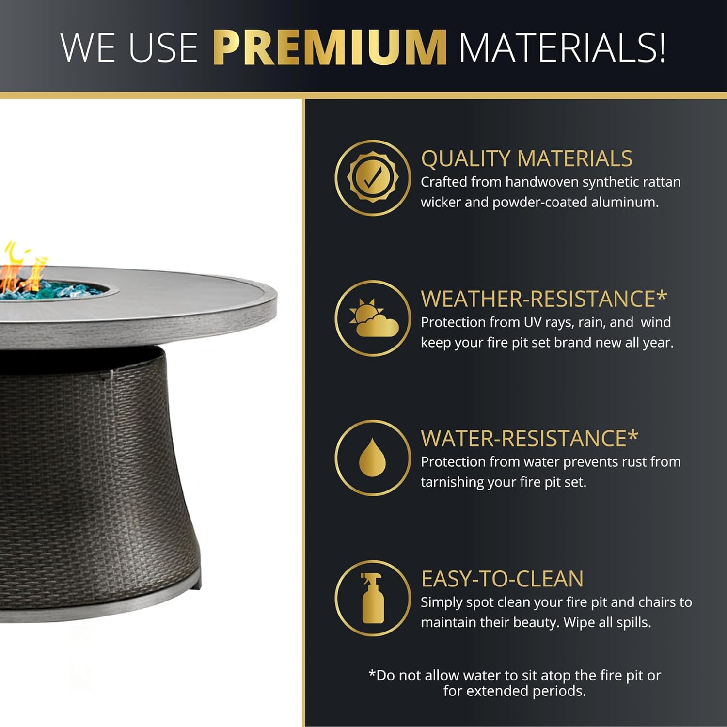 - ăPremium All-Weather MaterialsăDesigned for durability, our aluminum patio furniture set features solid rust-proof aluminum frames and hand-woven fade-resistant resin wicker that withstands sun, rain, and changing weather conditions. The gas fire pit table and matching chairs maintain their elegance season after season. Backed by a 3-year limited warranty covering manufacturing and shipping defects for your peace of mind.