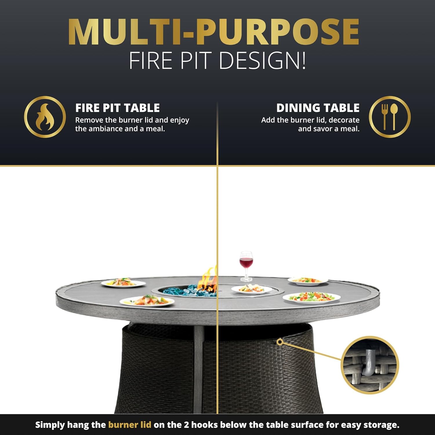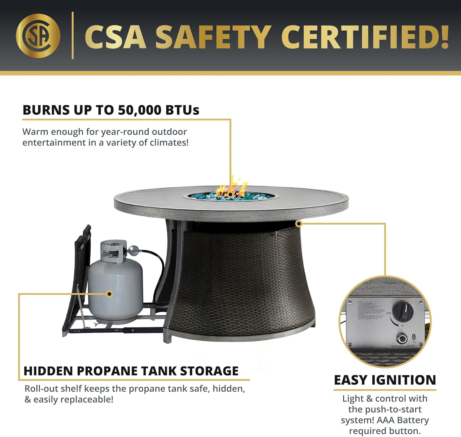 - ăCSA-Certified Safe HeatingăOur 50,000 BTU propane fire pit table is CSA-certified for both residential and commercial use, providing smokeless, clean-burning heat. The innovative design includes a hidden pullout propane tank holder that keeps your space tidy, while the push-button ignition system ensures effortless operation. A safer, cleaner alternative to traditional wood-burning fire pits.
