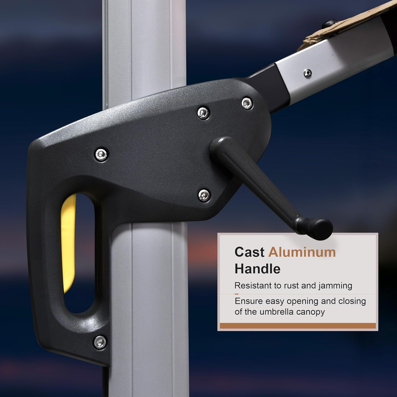 - This cantilever umbrella has unique handle design and crank system, 6 height and angle to choose, 360-degree rotation for easier shading area control